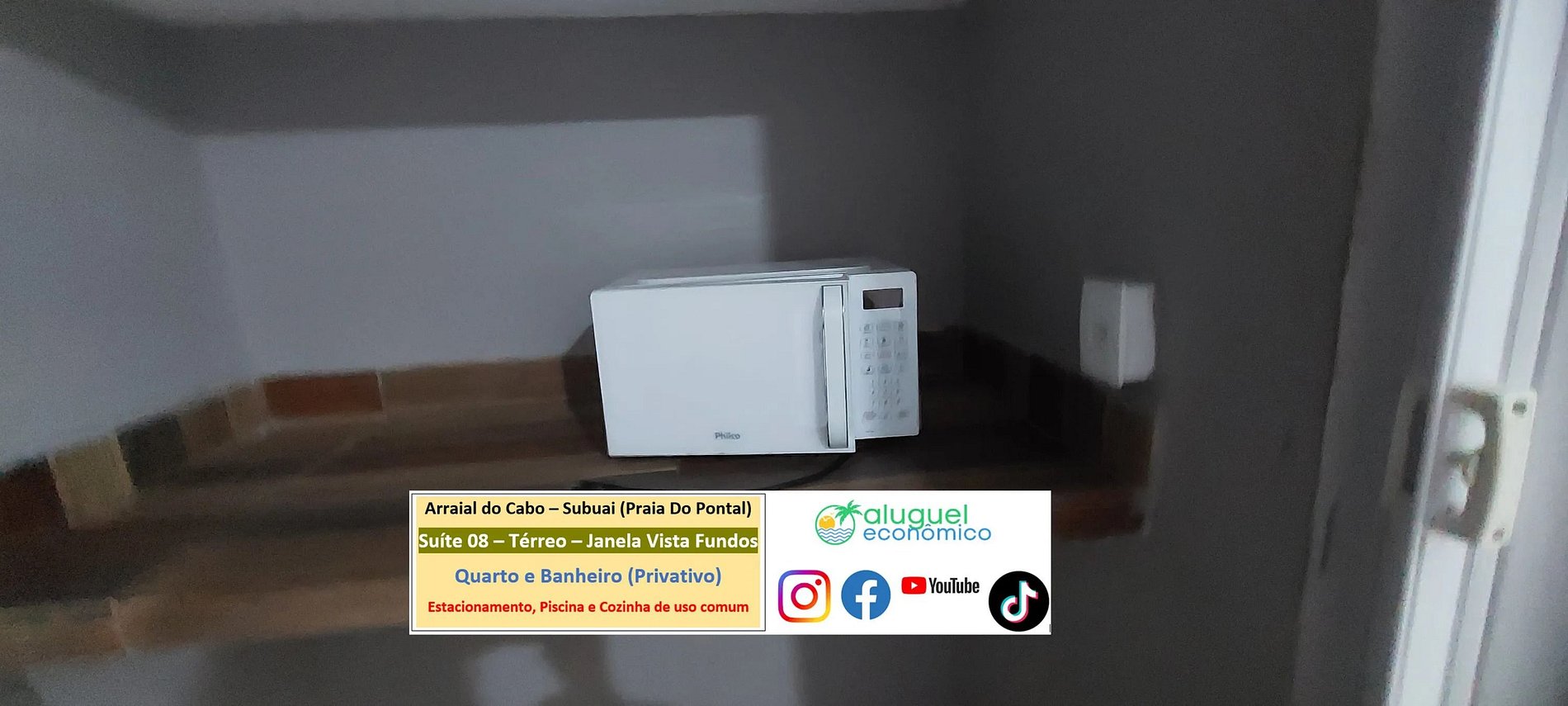 Imóvel com quarto e banheiro (suíte) privativo (Janela com vista para os fundos). Fica localizado na Praia do Pontal (Arraial do Cabo) na divisa com a cidade de Cabo Frio. Há banheiro com box e chuveiro elétrico. No quarto tem cama de casal, beliche, travesseiros, geladeira, forno micro-ondas, ventilador e TV. Há uma cozinha, de uso comum, com fogão, sanduicheira, liquidificador e utensílios. Há piscina de uso comum. Há Wi-Fi e estacionamento para um carro. Fica no térreo. Comporta até 4 pessoas