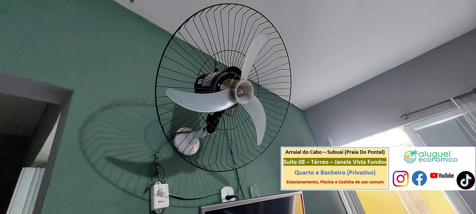 Imóvel com quarto e banheiro (suíte) privativo (Janela com vista para os fundos). Fica localizado na Praia do Pontal (Arraial do Cabo) na divisa com a cidade de Cabo Frio. Há banheiro com box e chuveiro elétrico. No quarto tem cama de casal, beliche, travesseiros, geladeira, forno micro-ondas, ventilador e TV. Há uma cozinha, de uso comum, com fogão, sanduicheira, liquidificador e utensílios. Há piscina de uso comum. Há Wi-Fi e estacionamento para um carro. Fica no térreo. Comporta até 4 pessoas