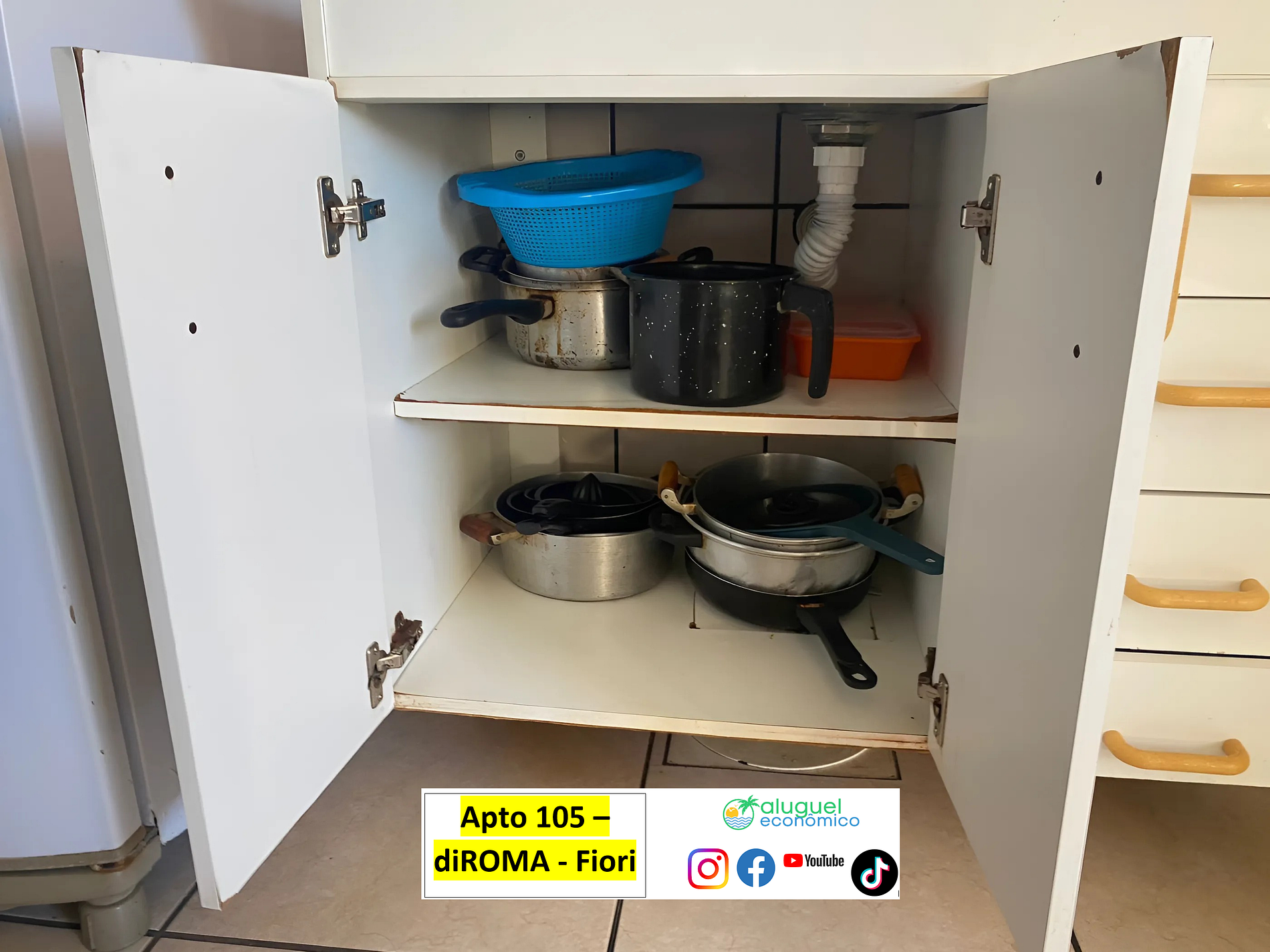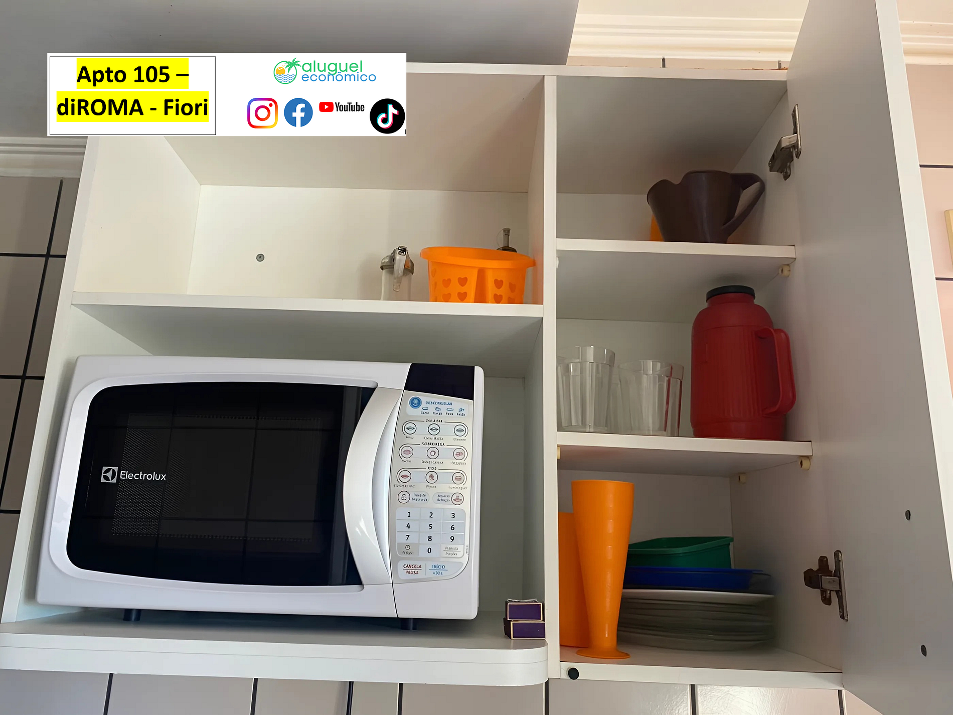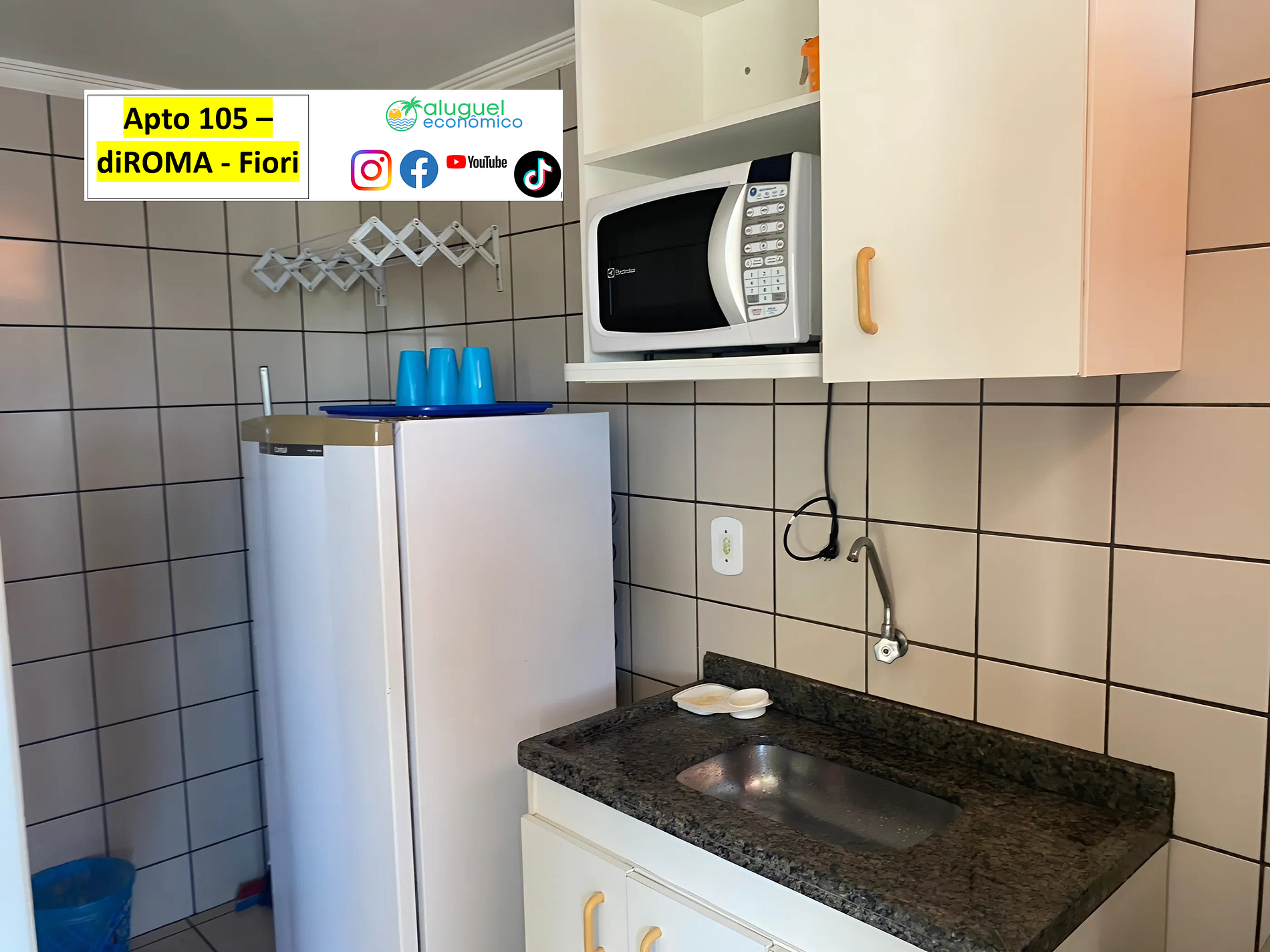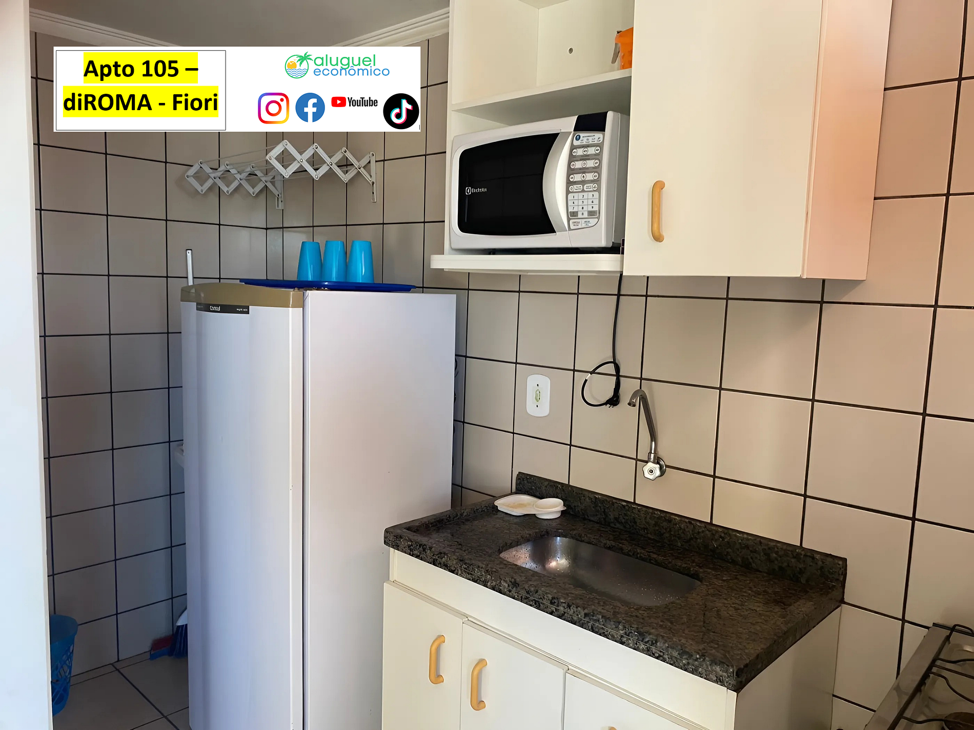 O apartamento 105 fica no térreo, é de 1 quarto , com cama de casal, ar condicionado, ventilador de teto, armário, criados-mudo e TV, banheiro com box blindex, sala com um sofá. cama com uma bicama, bancada com duas banquetas, ventilador, televisão de 20’ que pode ser assistida no quarto ou na sala, cozinha com geladeira, fogão, micro-ondas e armários com utensílios de cozinha, na área de serviço há tanque e pequeno varal.
