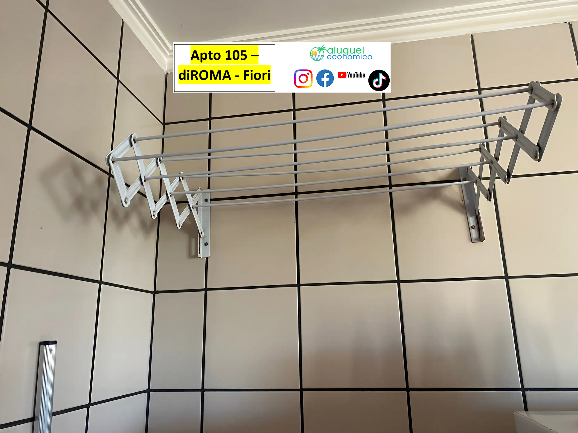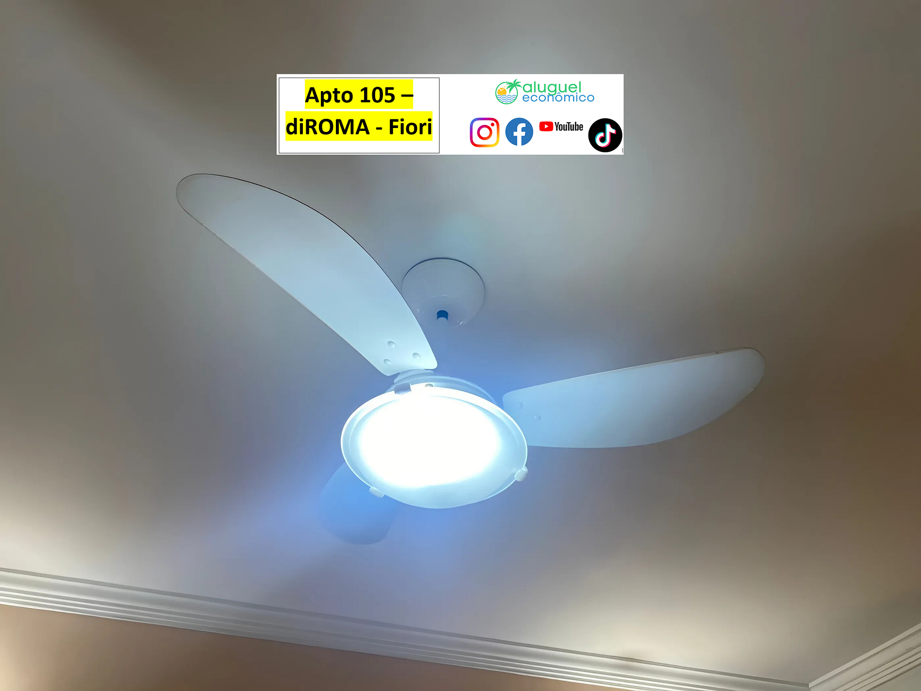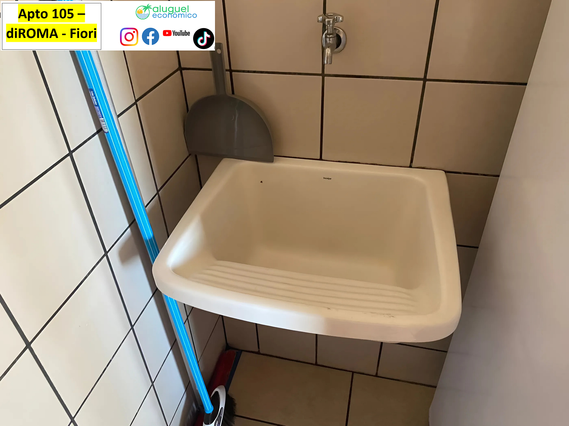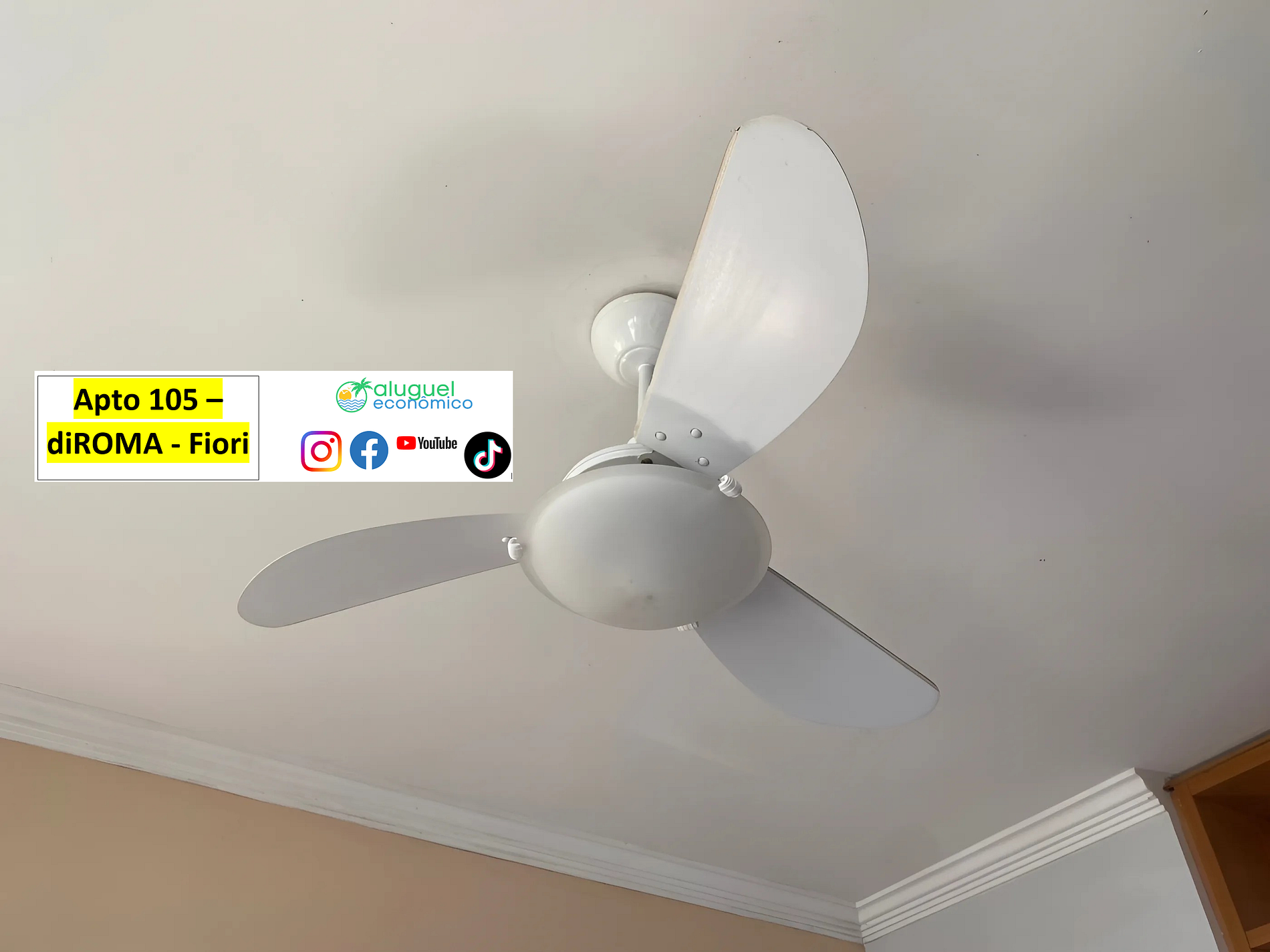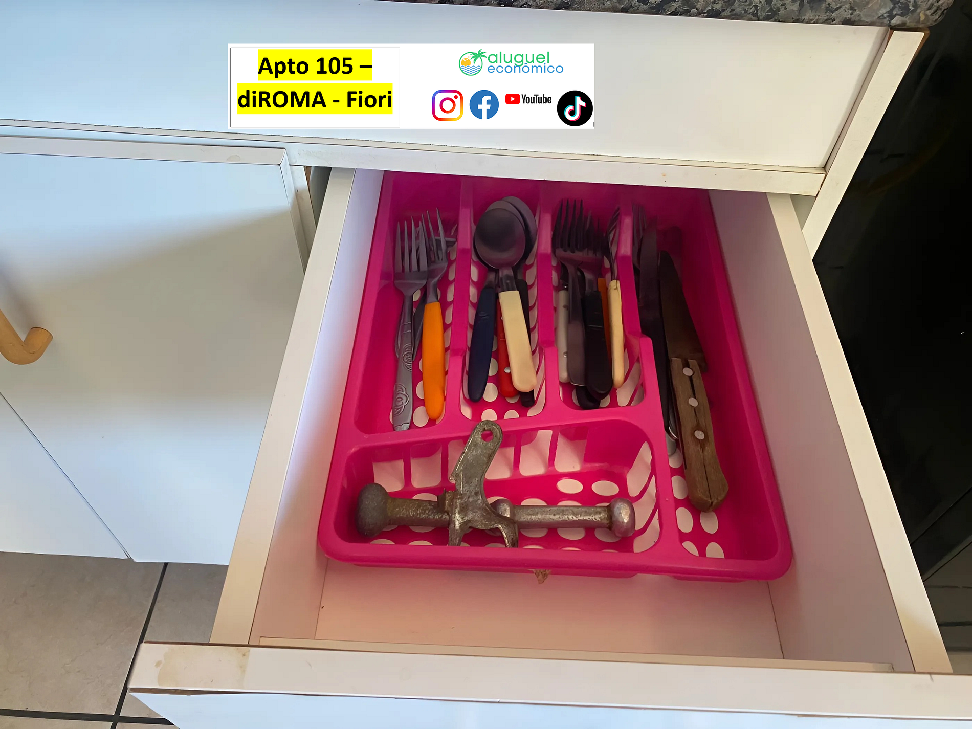 O apartamento 105 fica no térreo, é de 1 quarto , com cama de casal, ar condicionado, ventilador de teto, armário, criados-mudo e TV, banheiro com box blindex, sala com um sofá. cama com uma bicama, bancada com duas banquetas, ventilador, televisão de 20’ que pode ser assistida no quarto ou na sala, cozinha com geladeira, fogão, micro-ondas e armários com utensílios de cozinha, na área de serviço há tanque e pequeno varal.