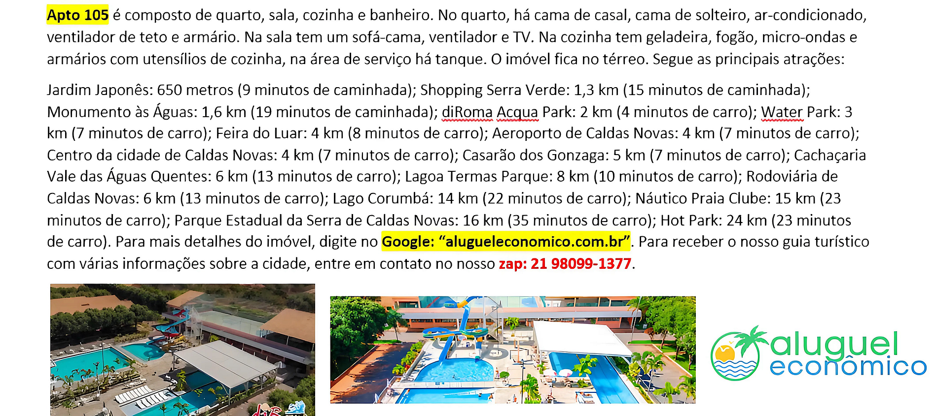 O imóvel é composto com quarto, sala, cozinha e banheiro. No quarto, há cama de casal, ar condicionado, ventilador de teto, armário e TV. O banheiro conta com box e chuveiro quente. Na sala tem um bicama, ventilador e TV. Na cozinha tem geladeira, fogão, micro-ondas e armários com utensílios de cozinha, na área de serviço há tanque. O imóvel fica no térreo. Não disponibilizamos produtos de higiene pessoal, nem roupa de cama e banho. O apto fica em local tranquilo próximo do parque aquático.