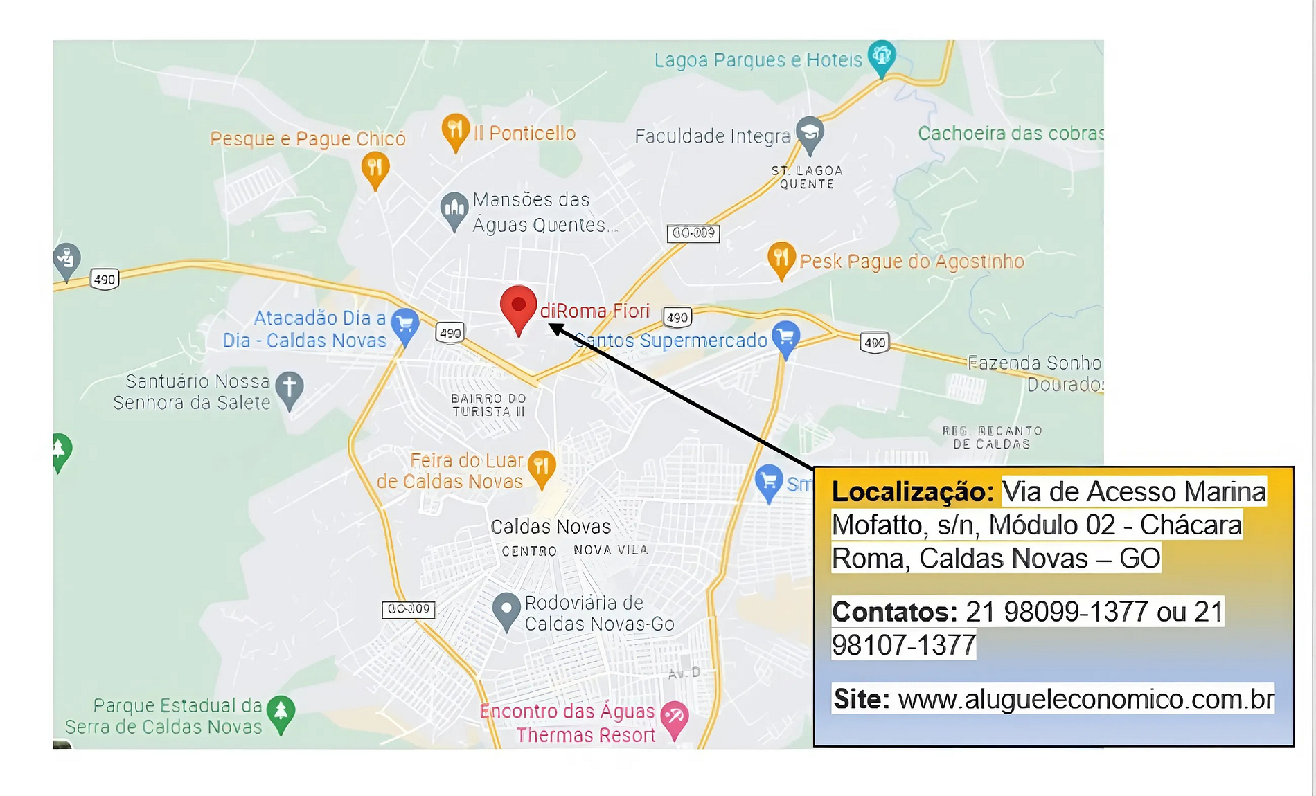 O endereço é: Via de Acesso Marina Mofatto, s/n, Módulo 02, Chácara Roma, Caldas Novas - Goiás,