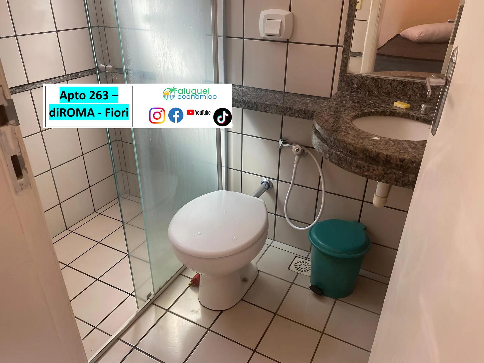 O apartamento 263 fica no térreo, é de 1 quarto , com cama de casal, ar condicionado, ventilador de teto, armário, criados-mudo e TV, banheiro com box blindex, na sala, há um sofá. cama com uma bicama, ventilador de teto, televisão, na cozinha há um frigobar, fogão, micro-ondas e armários com utensílios de cozinha, não há área de serviço, mas existe mais um banheiro social, totalizando assim, dois nesta unidade.