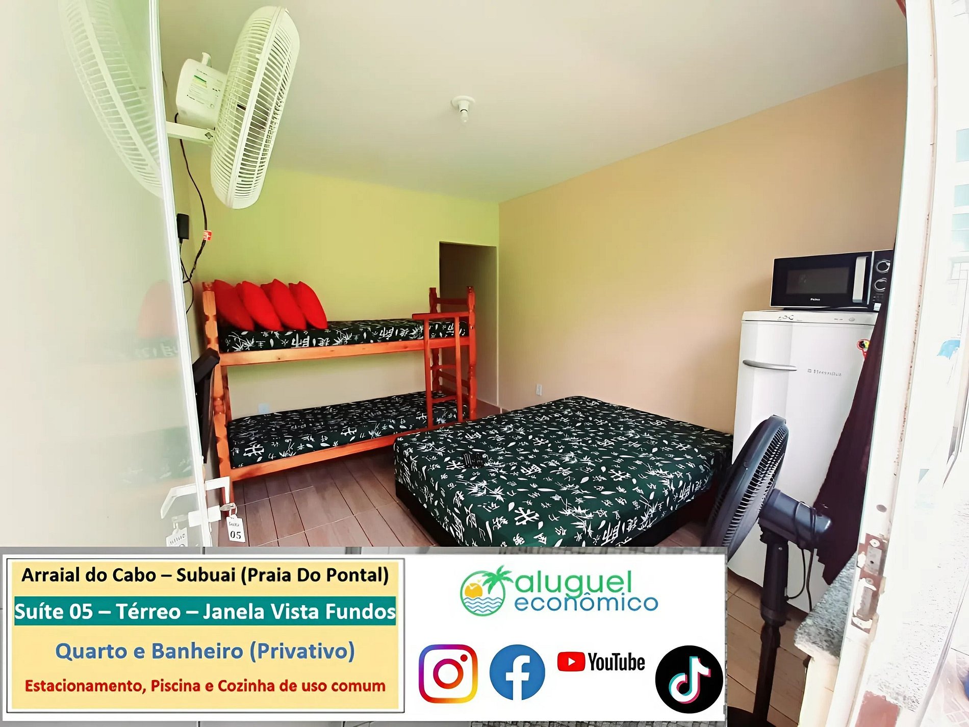 Imóvel com quarto e banheiro (suíte) privativo (Janela com vista para os fundos). Fica localizado na Praia do Pontal (Arraial do Cabo) na divisa com a cidade de Cabo Frio. Há banheiro com box e chuveiro elétrico. No quarto tem cama de casal, beliche, travesseiros, geladeira, forno micro-ondas, ventilador e TV. Há uma cozinha, de uso comum, com fogão, sanduicheira, liquidificador e utensílios. Há piscina de uso comum. Há Wi-Fi e estacionamento para um carro. Fica no térreo. Comporta até 4 pessoas
