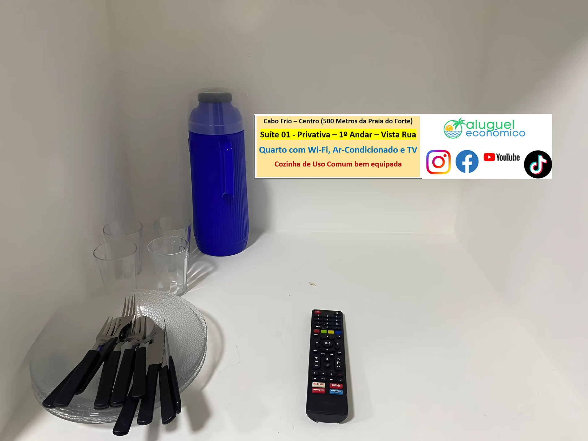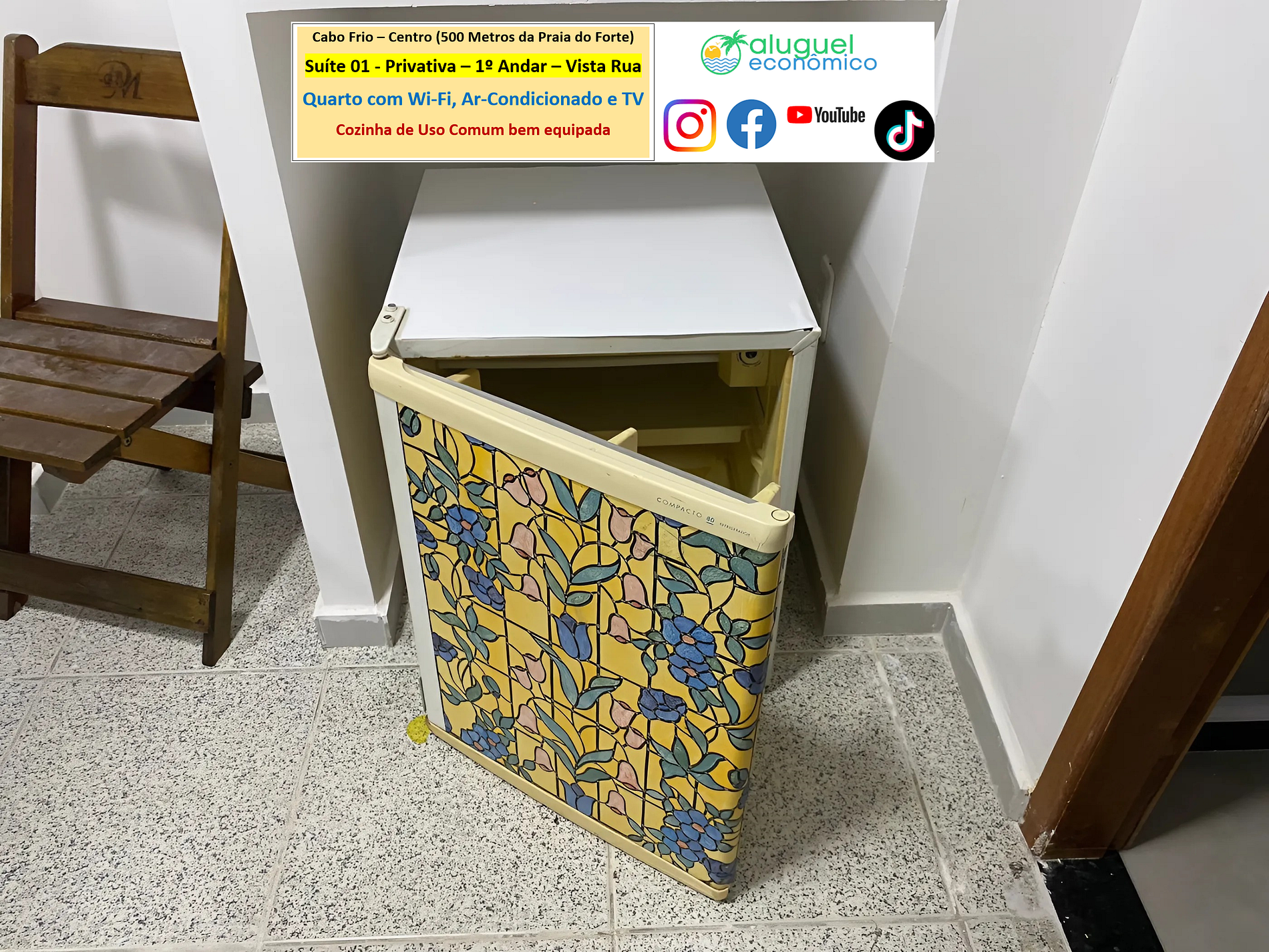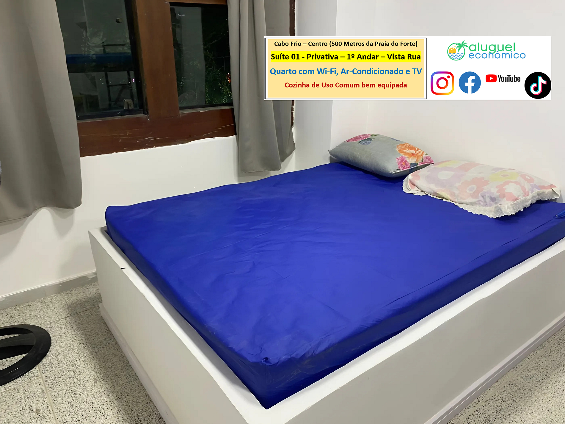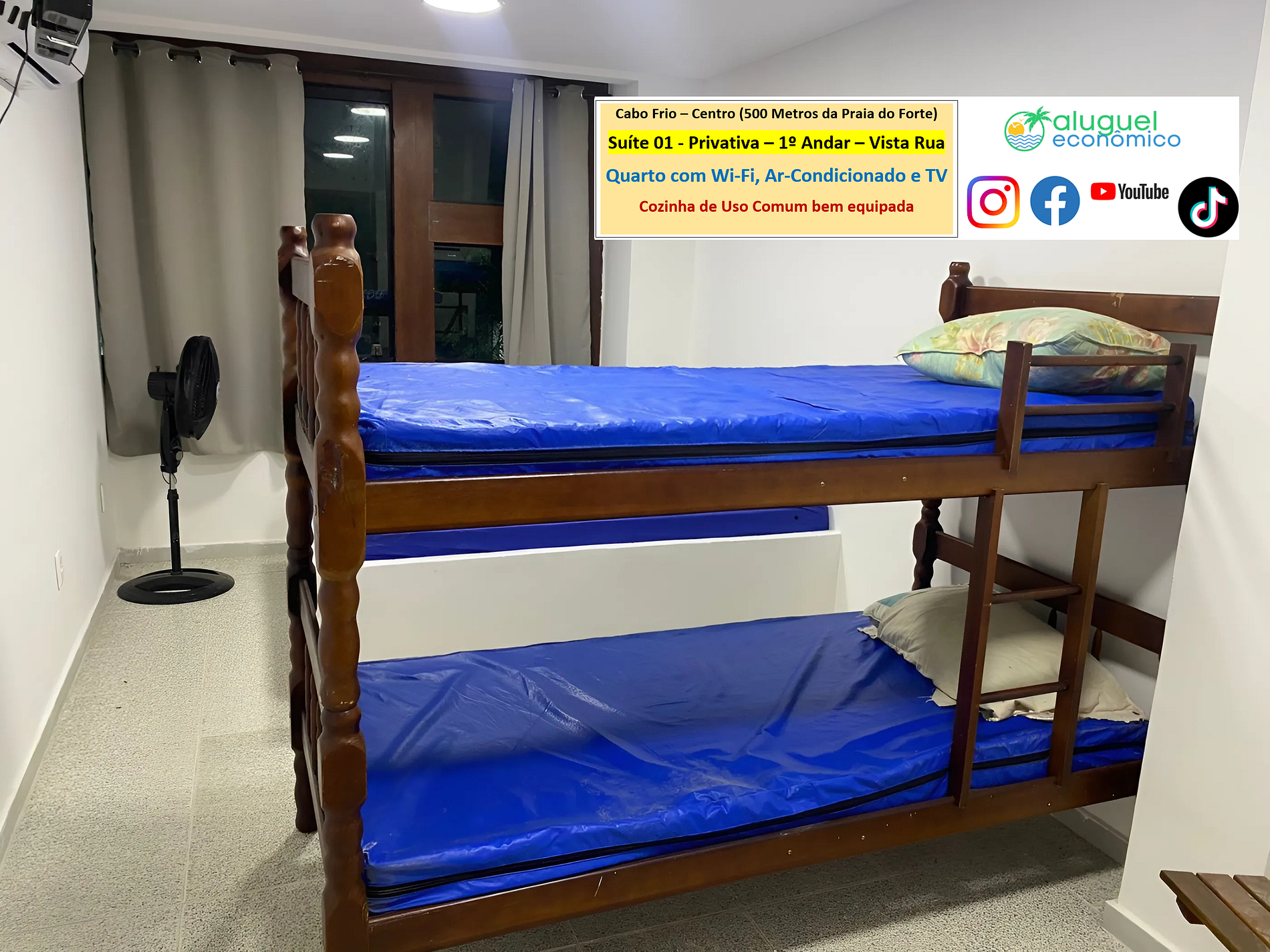 Suíte privativa (quarto e banheiro) no Centro de Cabo Frio, a 550 metros da Praia do Forte. O quarto é equipado com televisão, ar-condicionado, ventilador, frigobar, cama de casal, beliche, pratos, copos, garrafa térmica e talheres. Na cozinha (de uso comum) tem forno micro-ondas, air fryer, forno elétrico, liquidificador e sanduicheira. Há Wi-Fi disponível. O imóvel fica no primeiro, tendo que subir escada. Tem janela com vista para a rua. Não Há estacionamento. É exigida identificação pessoal.