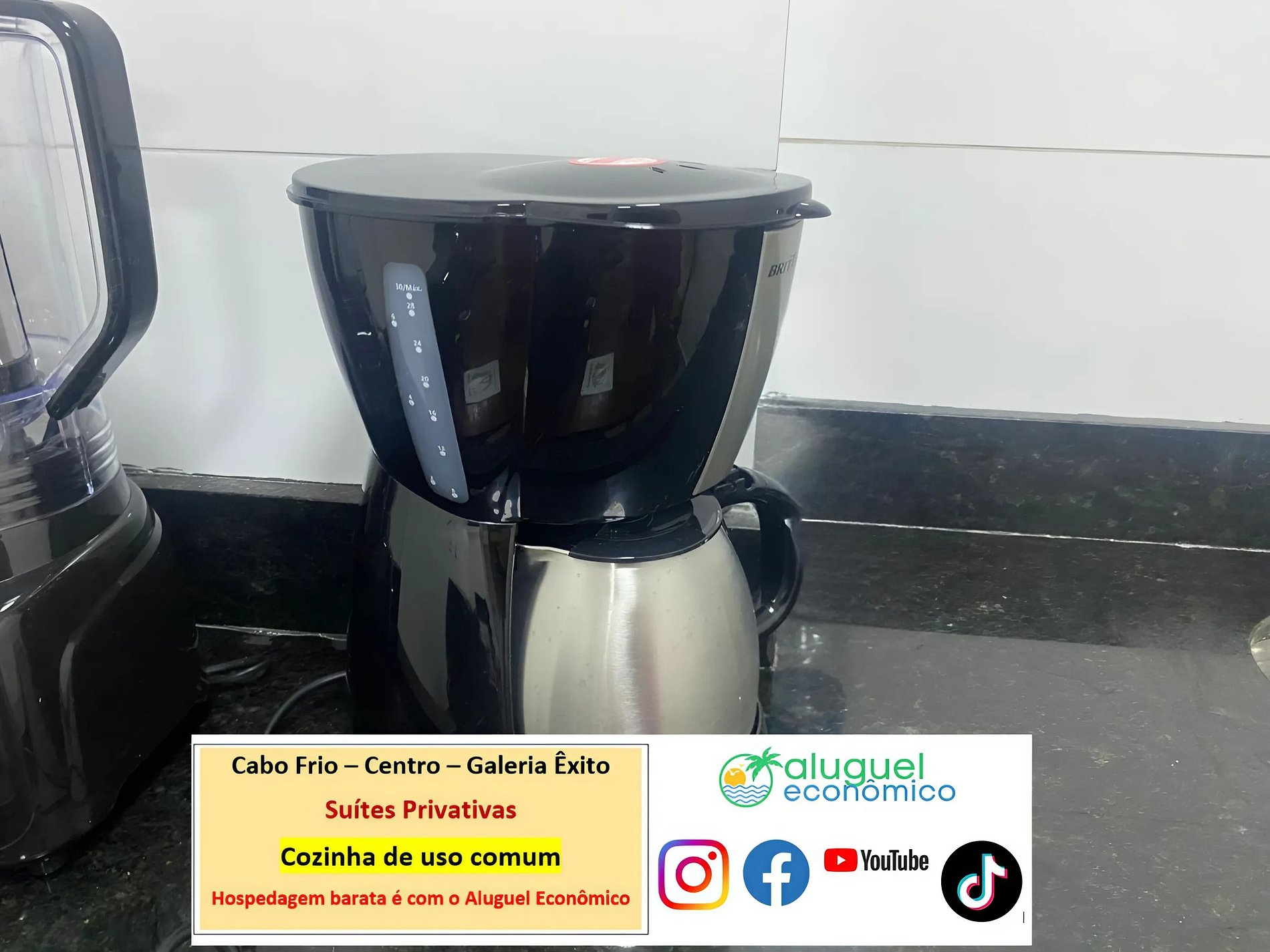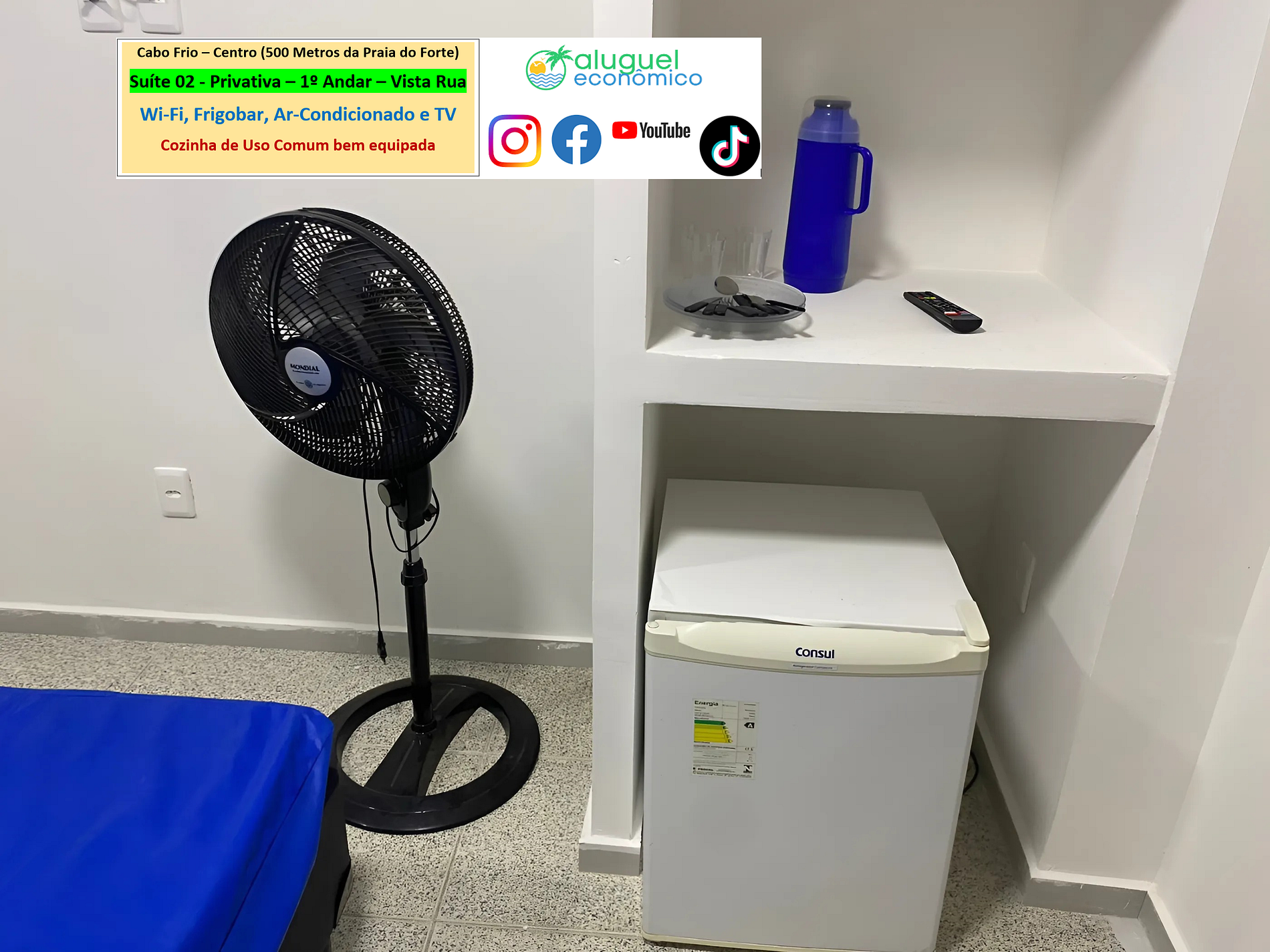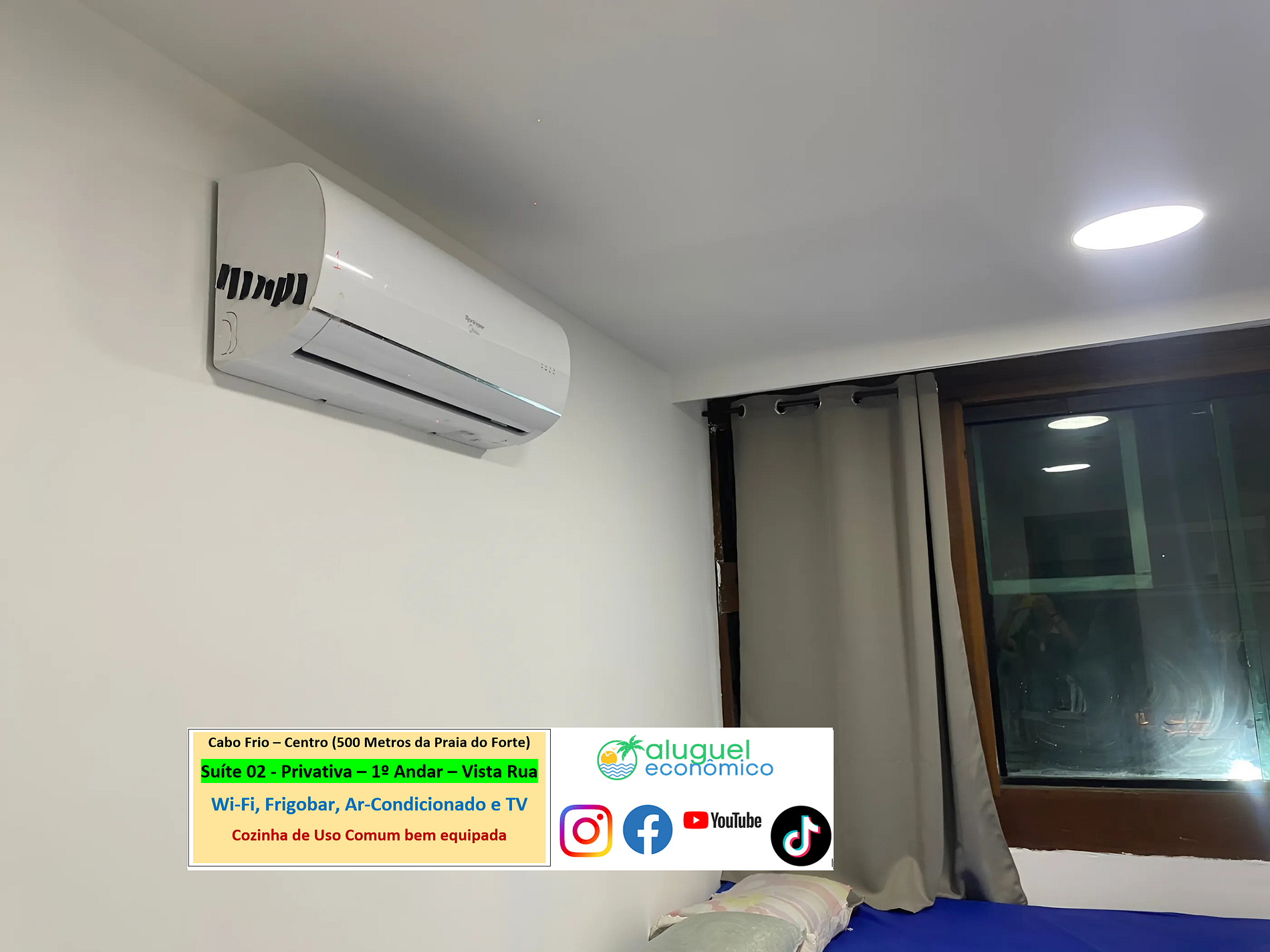 Suíte privativa (quarto e banheiro) no Centro de Cabo Frio, a 550 metros da Praia do Forte. O quarto é equipado com televisão, ar-condicionado, ventilador, frigobar, cama de casal, cama de solteiro, pratos, copos, garrafa térmica e talheres. Na cozinha (de uso comum) tem forno micro-ondas, air fryer, forno elétrico, liquidificador e sanduicheira. Há Wi-Fi. O imóvel fica no primeiro, tendo que subir escada. Tem janela com vista para a rua. Não Há estacionamento. É exigida identificação pessoal.