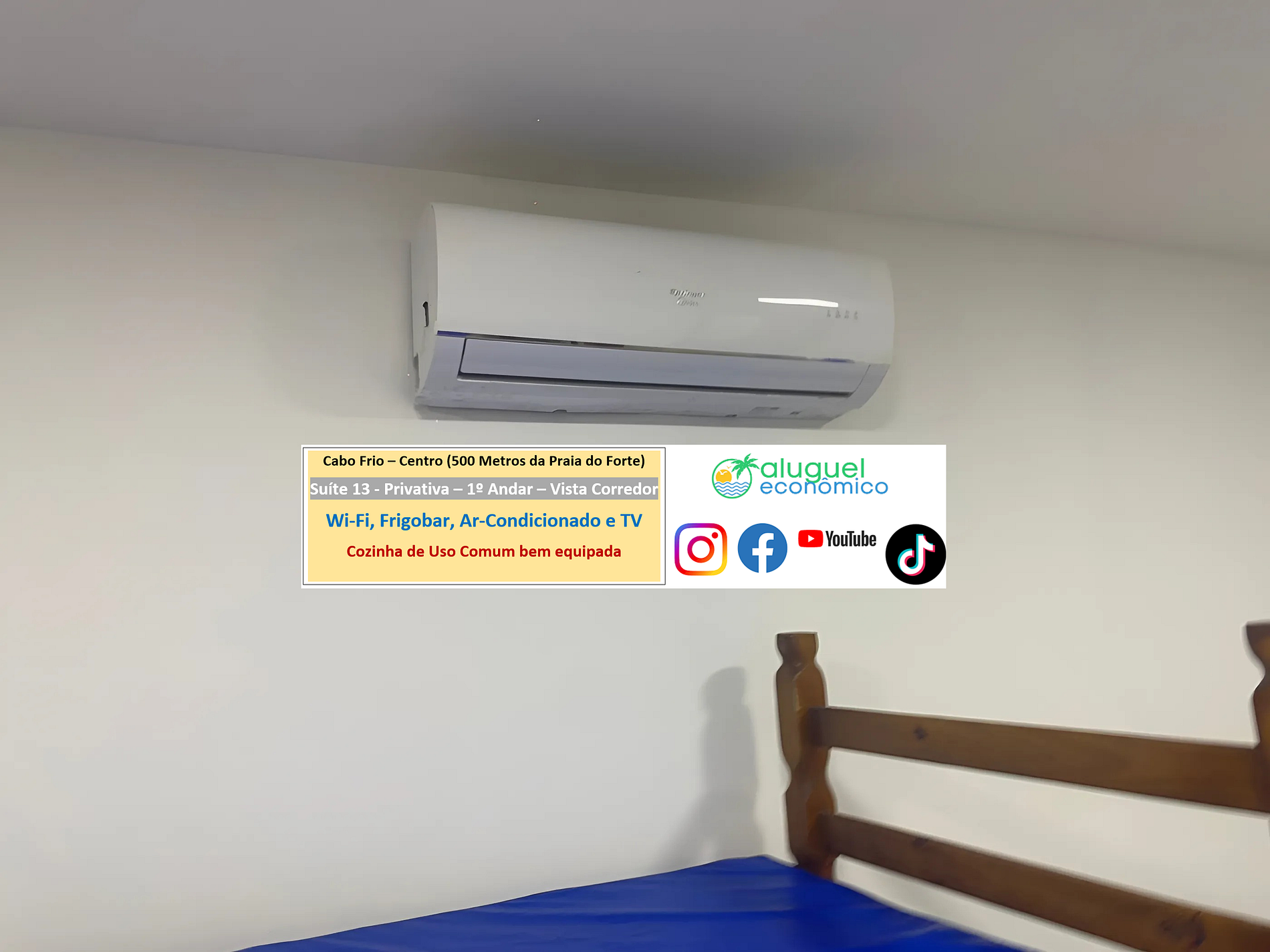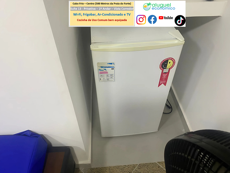 Suíte privativa (quarto e banheiro) no Centro de Cabo Frio, a 550 metros da Praia do Forte. O quarto é equipado com televisão, ar-condicionado, ventilador, frigobar, cama de casal, beliche, cama de solteiro, pratos, copos, garrafa térmica e talheres. Na cozinha (de uso comum) tem forno micro-ondas, air fryer, forno elétrico, liquidificador e sanduicheira. Há Wi-Fi. O imóvel fica no primeiro, tendo que subir escada. Tem janela para o corredor. Não Há estacionamento. Exigida identificação pessoal.