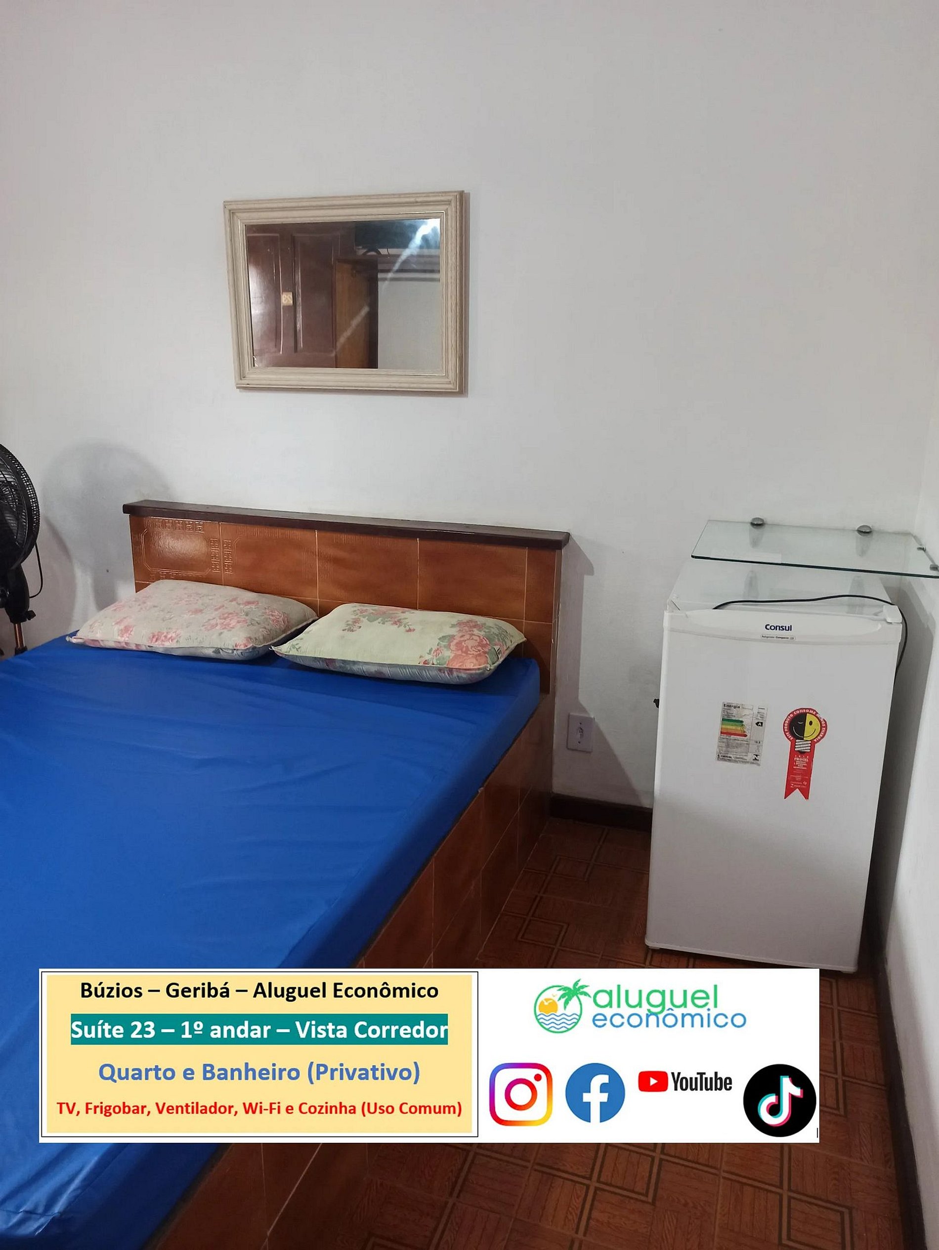 Imóvel privativo (quarto e banheiro) no 1º andar tendo que subir escada. Fica a 600 metros da Praia de Geribá. Janela com vista para o corredor. No quarto, há cama de casal, 2 sofás-camas de solteiro, armário, ventilador, TV, frigobar. No banheiro, há box com chuveiro elétrico. Há cozinha, de uso comum, com fogão, forno micro-ondas, liquidificador, sanduicheira, Airfryer, cafeteira e utensílios de cozinha. Wi-Fi gratuito. Estacionamento pago a parte. É exigida identificação pessoal dos hóspedes.