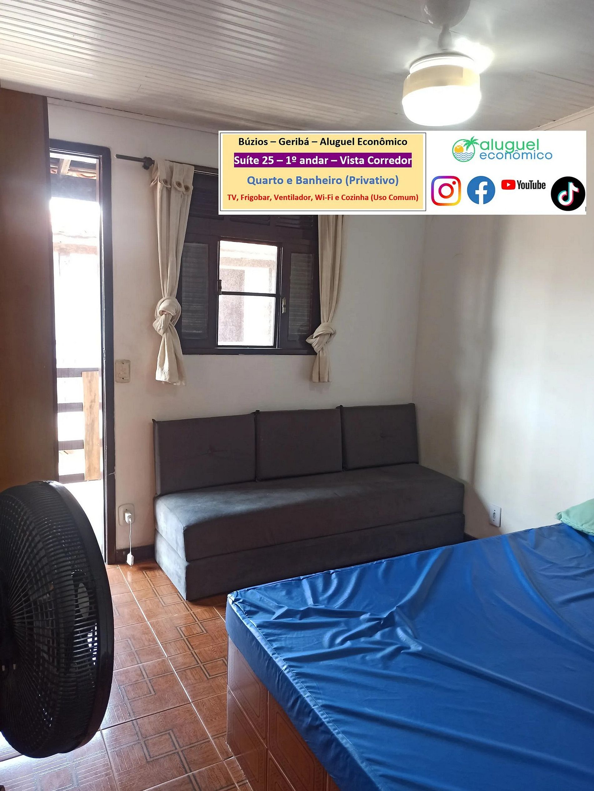 Imóvel privativo (quarto e banheiro) no 1º andar tendo que subir escada. Fica a 600 metros da Praia de Geribá. Janela com vista para o corredor. No quarto, há cama de casal, 2 sofás-camas de solteiro, armário, ventilador, TV, frigobar. No banheiro, há box com chuveiro elétrico. Há cozinha, de uso comum, com fogão, forno micro-ondas, liquidificador, sanduicheira, Airfryer, cafeteira e utensílios de cozinha. Wi-Fi gratuito. Estacionamento pago a parte. É exigida identificação pessoal dos hóspedes.