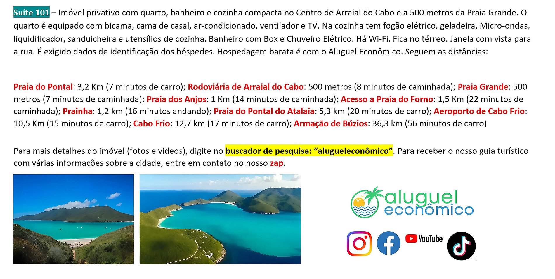 Imóvel privativo com quarto, banheiro e cozinha compacta no Centro de Arraial do Cabo e a 500 metros da Praia Grande. O quarto é equipado com bicama, cama de casal, ar-condicionado, ventilador e TV. Na cozinha tem fogão elétrico, frigobar, Micro-ondas, liquidificador, sanduicheira e utensílios de cozinha. Banheiro com Box e Chuveiro Elétrico. Há Wi-Fi. Fica no térreo. Janela com vista para a rua. É exigido dados de identificação dos hóspedes. Hospedagem barata é com o Aluguel Econômico.