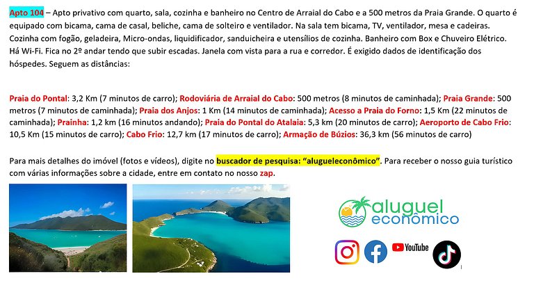 Apto privativo com quarto, sala, cozinha e banheiro no Centro de Arraial do Cabo. O quarto é equipado com bicama, cama de casal, beliche, cama de solteiro e ventilador. Na sala tem bicama, TV, ventilador, mesa e cadeiras. Cozinha com fogão, geladeira, Micro-ondas, liquidificador, sanduicheira e utensílios de cozinha. Banheiro com Box e Chuveiro Elétrico. Há Wi-Fi. Fica no 2º andar tendo que subir escadas. Janela com vista para a rua e corredor. É exigido dados de identificação dos hóspedes.