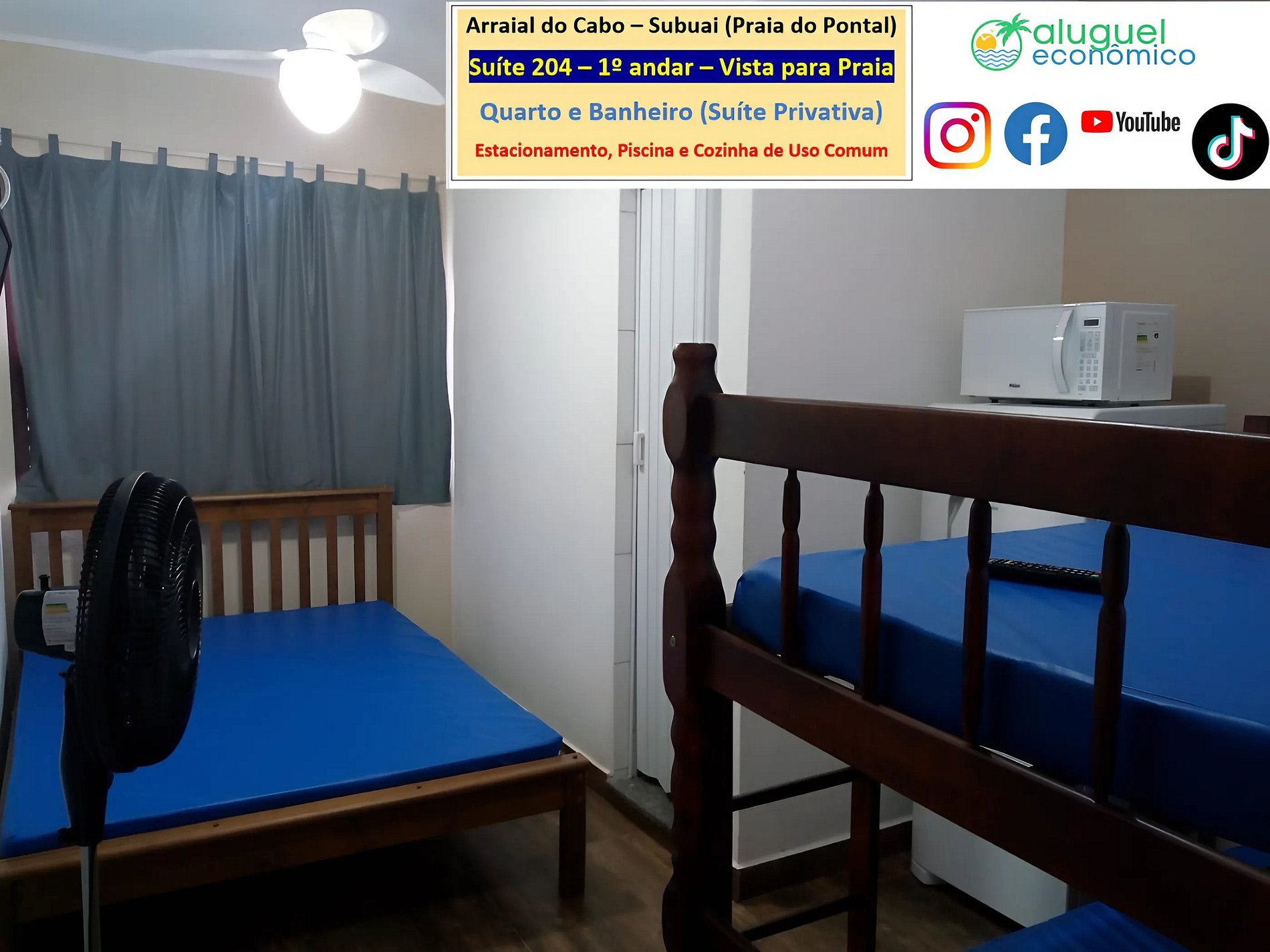 Imóvel com quarto e banheiro privativo. Janela com vista para a Praia do Pontal. Localizado na Praia do Pontal (Arraial do Cabo) na divisa a cidade de Cabo Frio. Há banheiro com box e chuveiro elétrico. No quarto tem cama de casal, beliche, travesseiros, geladeira, forno micro-ondas, ventilador e TV. Há uma cozinha, de uso comum, com fogão, sanduicheira, liquidificador e utensílios. Há piscina de uso comum. Há Wi-Fi e estacionamento para um carro. Fica no primeiro andar, tendo que subir escadas.
