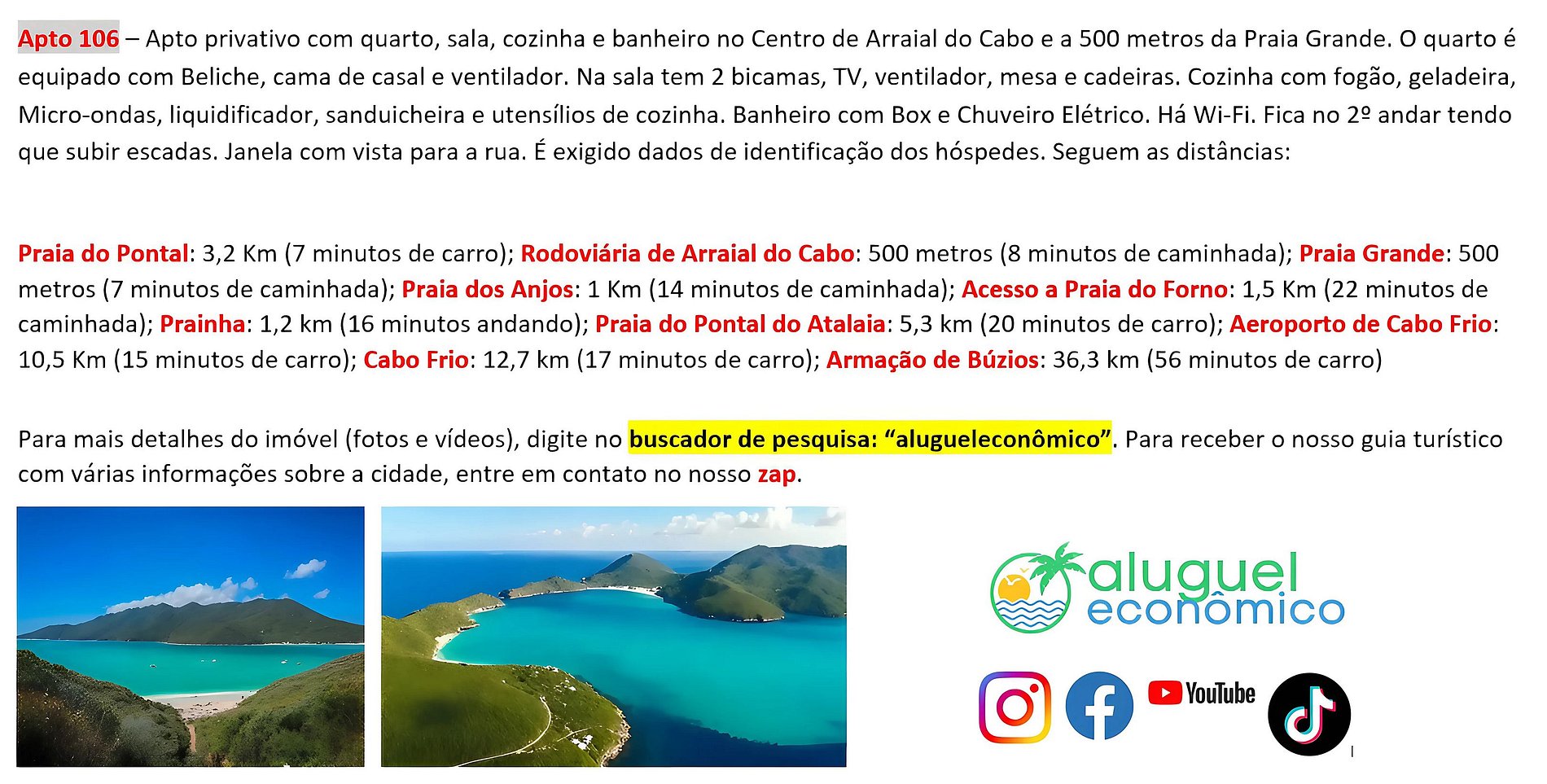 Apto privativo com quarto, sala, cozinha e banheiro no Centro de Arraial do Cabo e a 500 metros da Praia Grande. O quarto é equipado com Beliche, cama de casal e ventilador. Na sala tem 2 bicamas, TV, ventilador, mesa e cadeiras. Cozinha com fogão, geladeira, Micro-ondas, liquidificador, sanduicheira e utensílios de cozinha. Banheiro com Box e Chuveiro Elétrico. Há Wi-Fi. Fica no 2º andar tendo que subir escadas. Janela com vista para a rua. É exigido dados de identificação dos hóspedes.